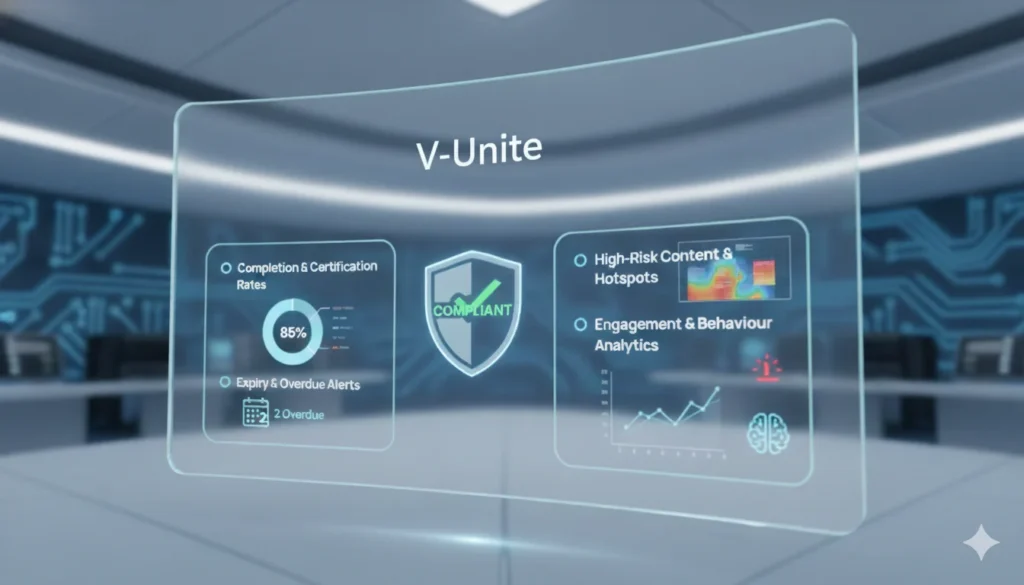 Dashboards show completions, expiries, high-risk areas, and team or site compliance status.